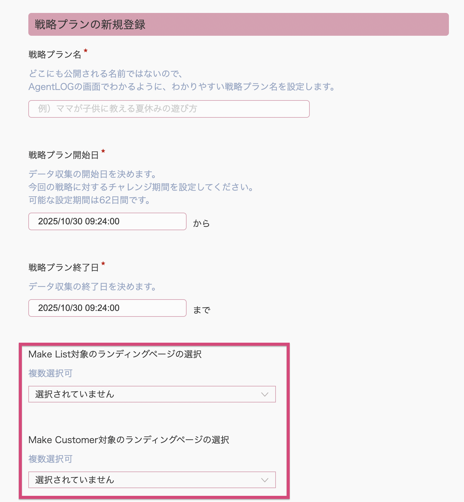 メイクカスタマーには、1つ以上のランディングページ設定が必須