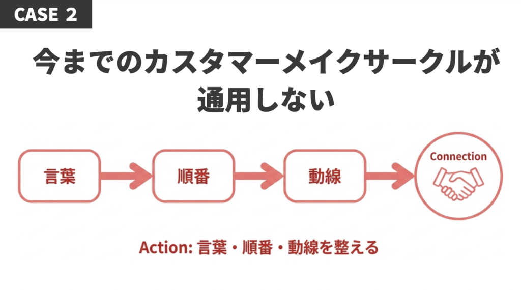 ケース②従来の流れが通用せず、言葉→順番→動線を整え「今すぐ」より「明日も考えたくなる言葉」を設計