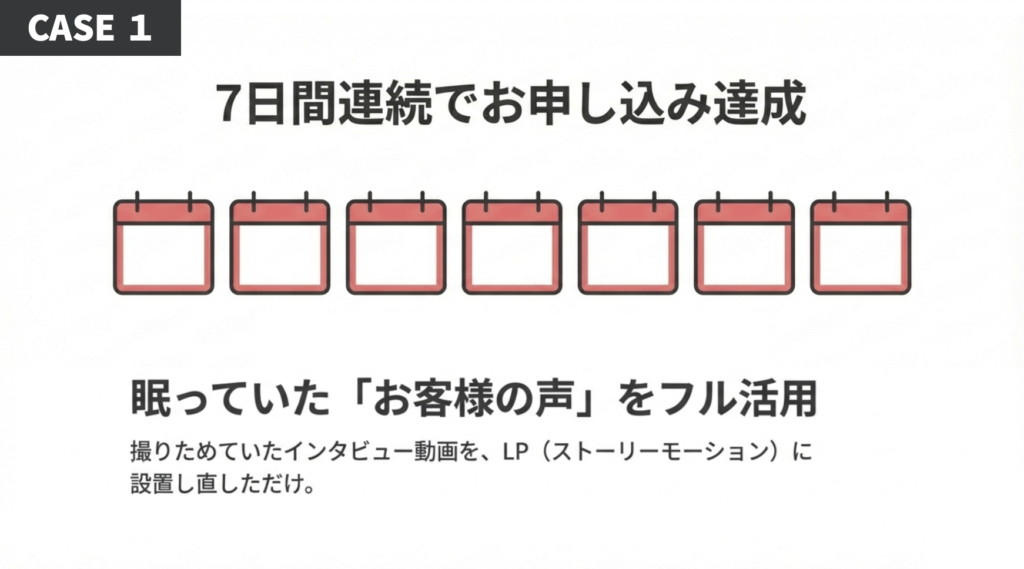 ケース①眠っていた「お客様の声」インタビュー動画をLP(ストーリーモーション)に置き直し、7日連続で申込み達成