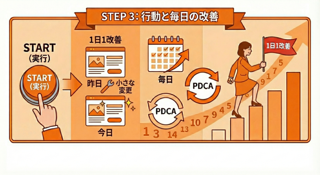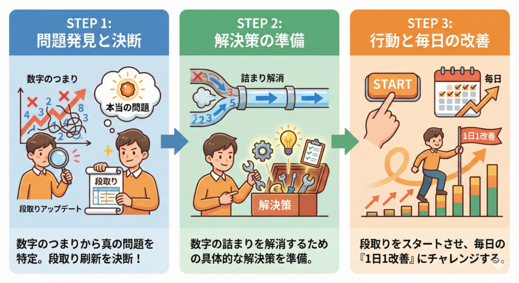 「1日1改善」とは、難しい分析をすることではありません。「今日はこれをお客さまに聞いてみよう(試してみよう)」という、小さな実験の繰り返しです。その実験の数だけ、あなたは「本当の正解」=成果に近づいていきます。