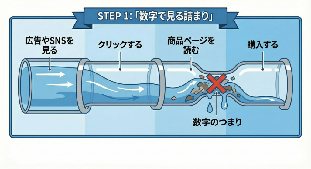 マーケティングは「水の流れ」のようなものです。例えば「広告やSNSを見る → クリックする → 商品ページを読む → 購入する」という流れがあります。その中で「つまり」とは、水が止まっている場所です。