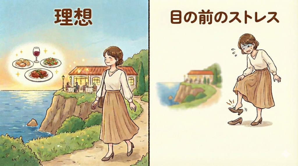 あなたは今、とても素敵なレストランに向かって歩いています。そこに行けば、最高の料理と素敵な景色が待っています(=理想)。