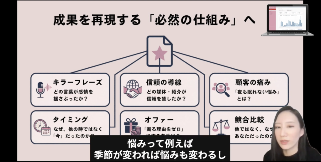 原因は、どの行動が成果につながっているのかが見えていないこと。つまり、「うまくいったとき」と「うまくいかなかったとき」の違いを言語化できていない状態です。