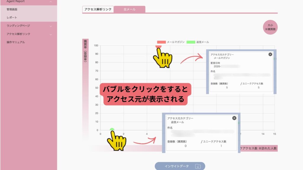 Agent LOGと連携しておくと、以下のように返信メールやステップメールなど全メールからのアクセスと購買状況をチェックするができます。