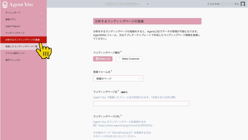 Agent LOGへのランディングページ登録はどこから?