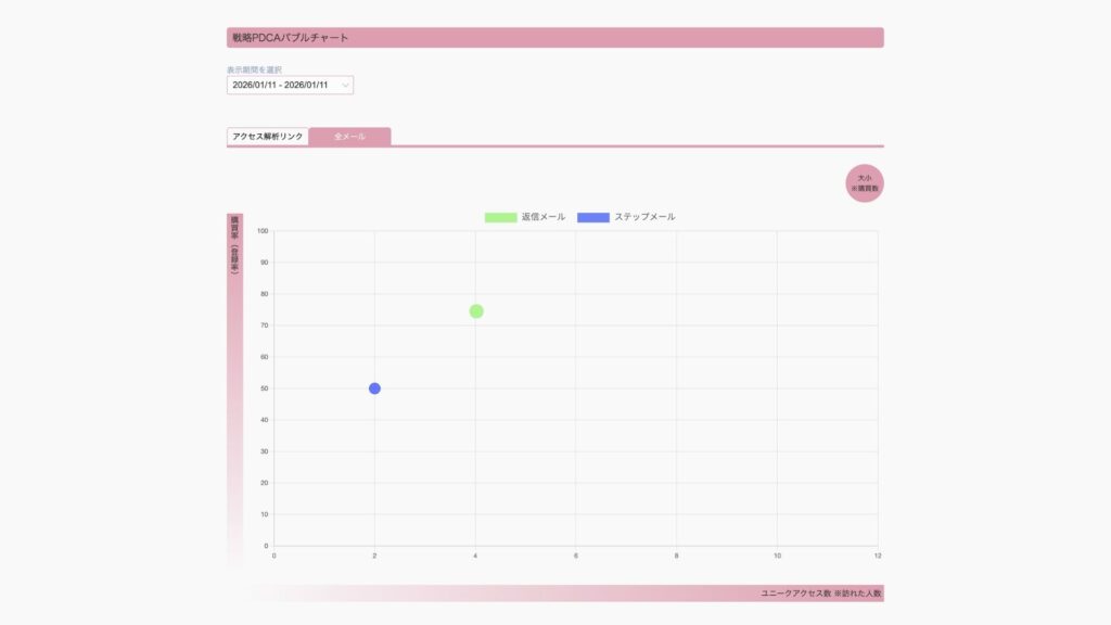 ※ただし、母数が小さい(バブルが左上にいる)場合は数字はブレやすいので、「強い兆し」として捉えつつ、件名(タイトル)/導入/リンク文(CTA)/オファー などに分解・テストを繰り返し再現性を確認します