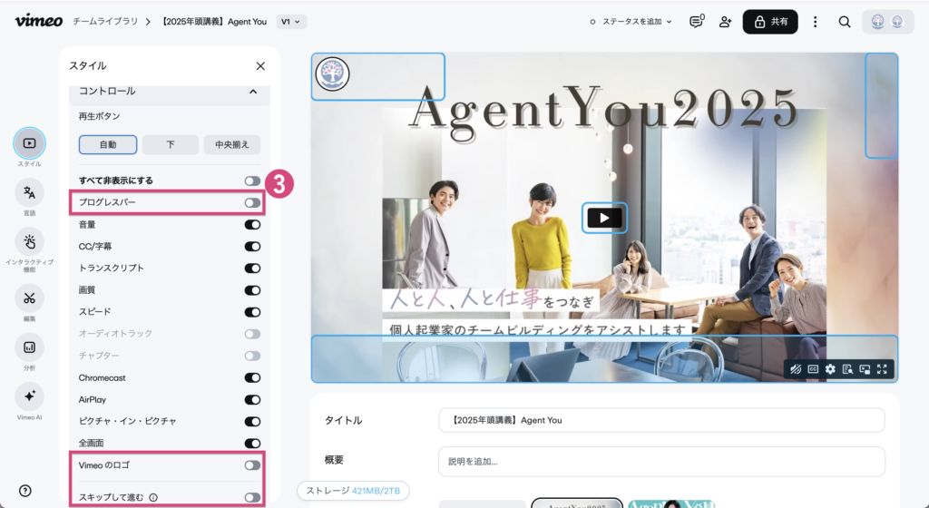 [スタイル]→[Vimeoロゴを表示]→ OFF